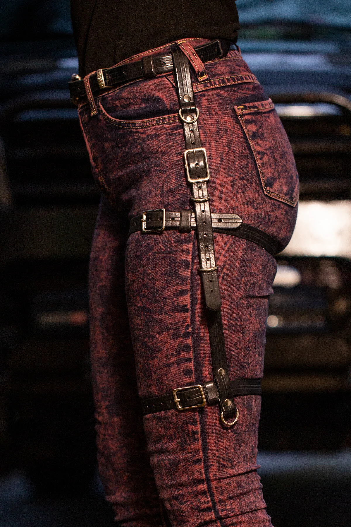 The ELFV!NG Leather Thigh Harness is a molle-like tactical leg strap rig with both fashion and function features. While the slick set-up screams “I’m a badass adventurer”, it also actually keeps your important stuff at arms reach and safely snugged up against your body. Allowing you to keep wearing those sexy tight pants that have pockets sized for parakeets. The side strap is fully adjustable, allowing the harness to be mounted from high-waist or true-hip positions, and fits over most belts (width 2 inches or less).